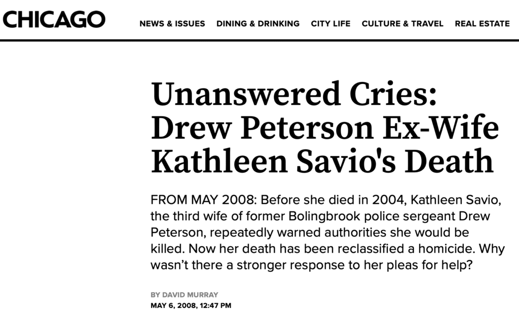 Almost 20 years ago, I wrote a story in Chicago Magazine involving Peterson, the Bolingbrook, Illinois cop who got national attention when his wife Stacy disappeared. Particularly suspicious on account of his first wife, Kathleen Savio, had turned up dead in a bloody bathtub a few years before.
