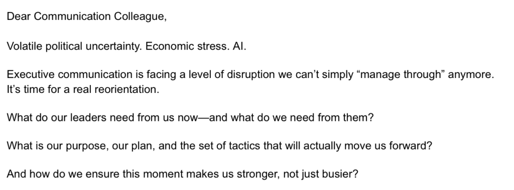 Which didn’t look too bad at first. Until I started tweaking. I mean, I wouldn’t put “manage through” in quotes like that. Also, I don’t believe there’s some pre-existing “set of tactics” that will “move us forward”? Also, I don’t say, “move us forward,” because I don’t believe “we,” are really supposed to move in any one direction, like a bunch of corporate robots. And I like the sound of “stronger, not just busier.” But I don’t really think stronger versus busier is the operative dichotomy here.